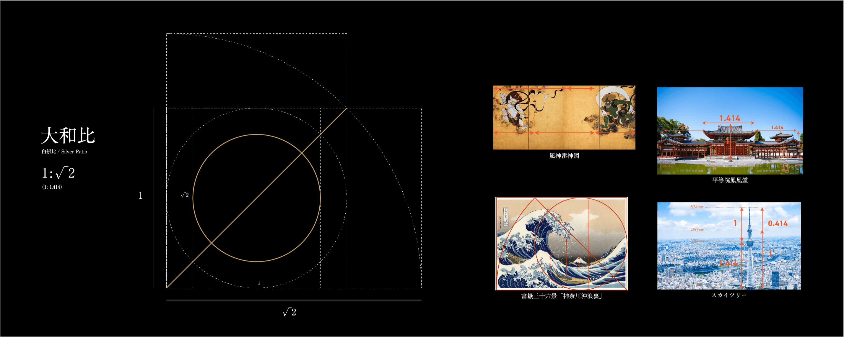 ロゴの設計には「白銀比(大和比)」を採用しました。西洋の黄金比が「華美」を導くのに対し、日本の白銀比は「簡素・調和・余白」を基調とする。法隆寺や平等院鳳凰堂、北斎の波に連なる日本的美学を継承し、普遍性と文化性を両立する構造美を体現しています。
